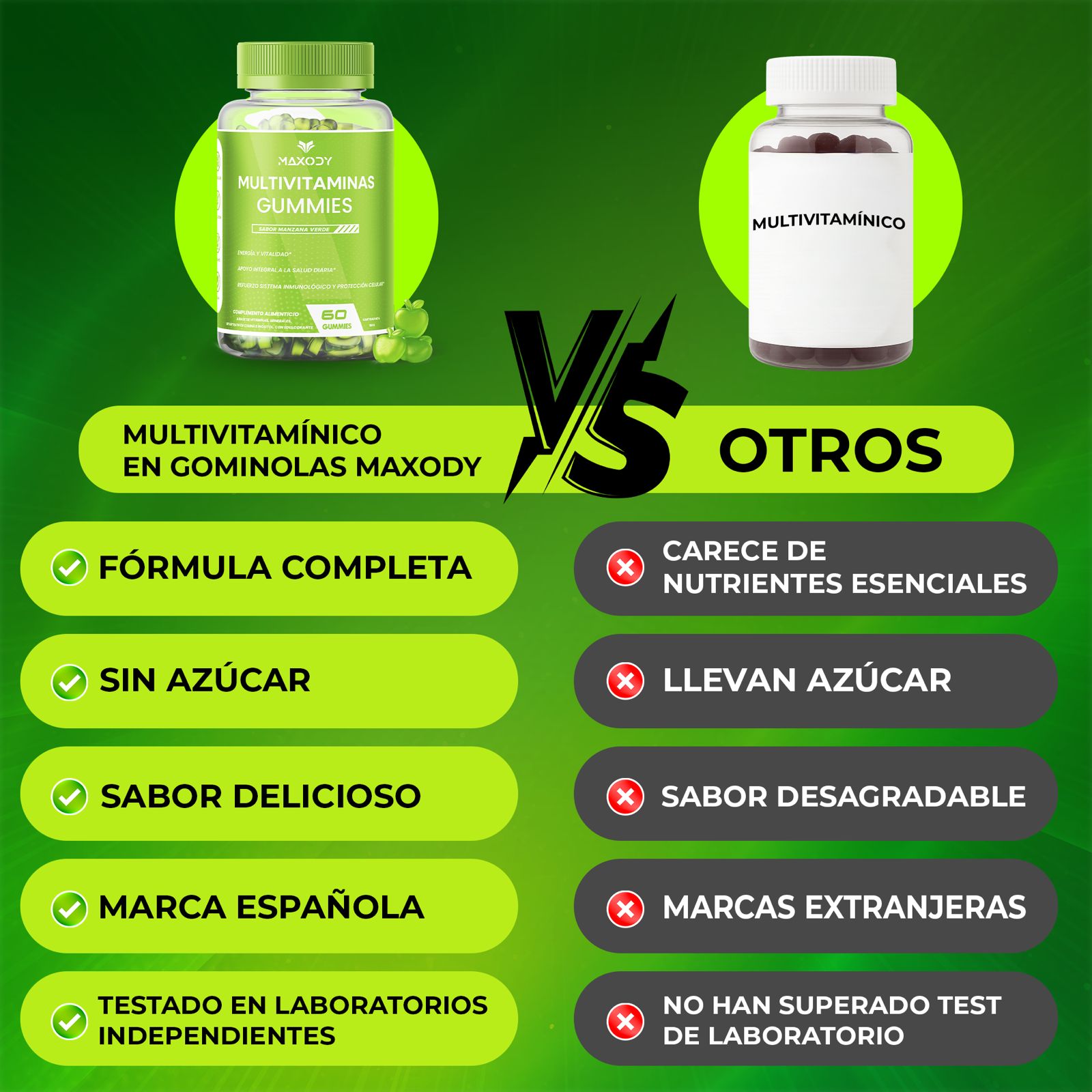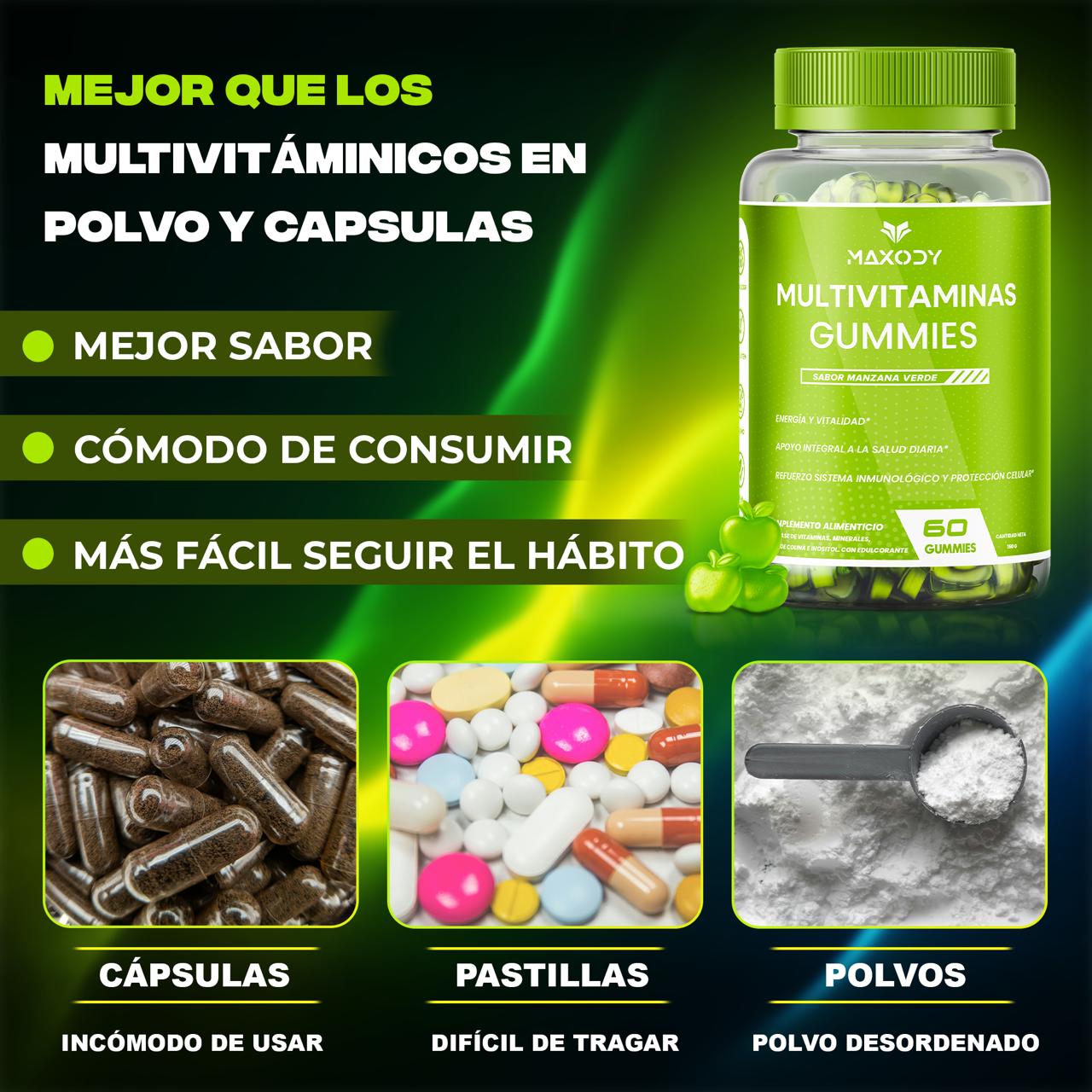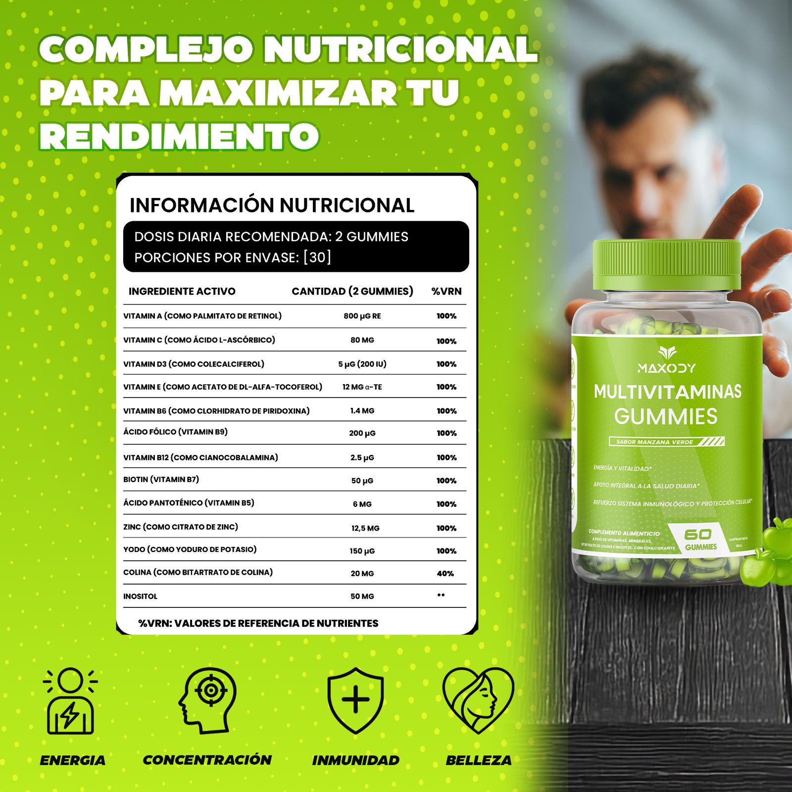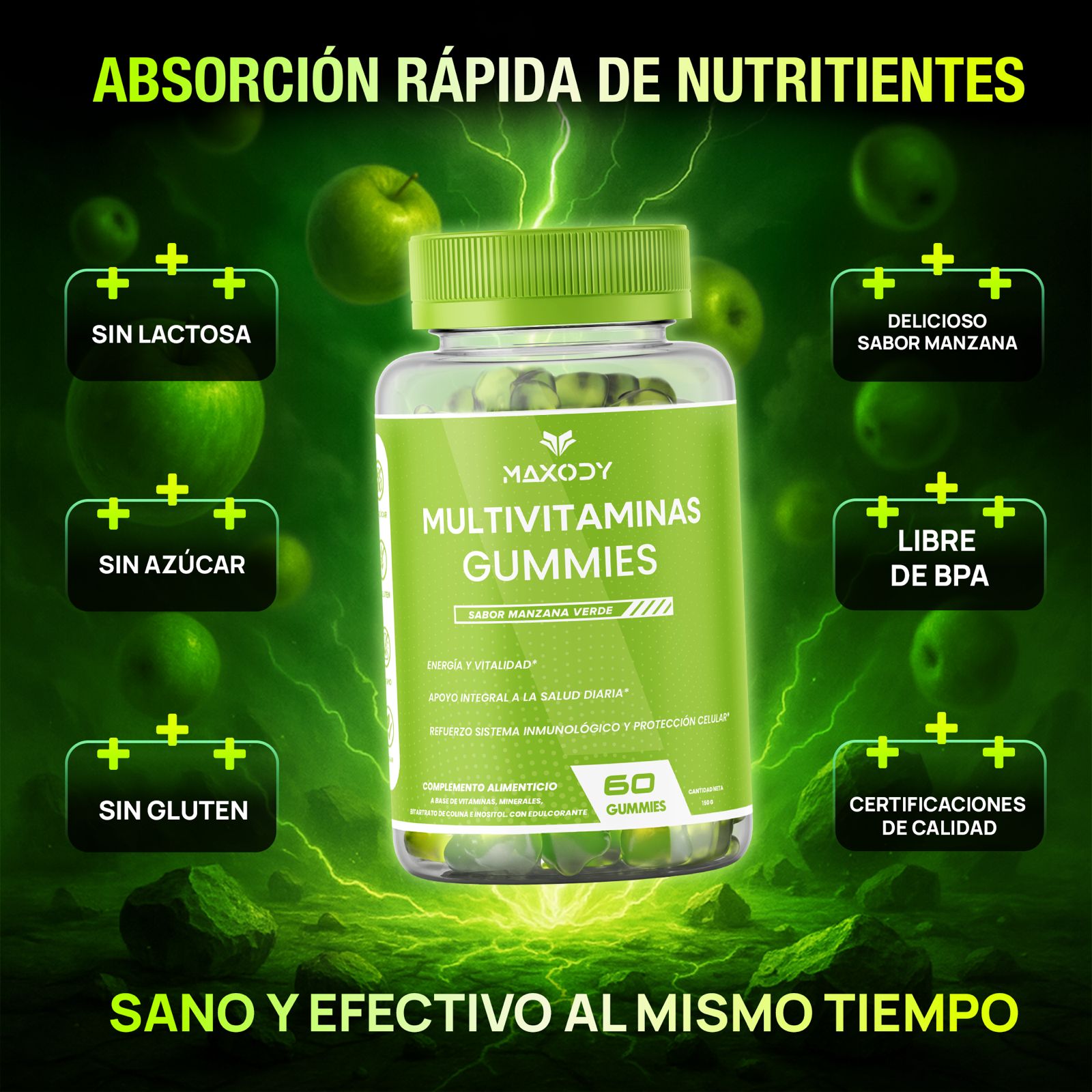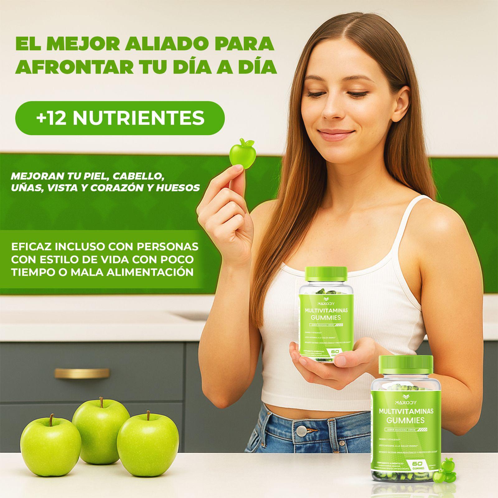 Nuestras Multivitaminas Gummies están formuladas con una combinación completa de vitaminas y minerales esenciales para apoyar el sistema inmunitario, la energía, la salud de la piel, el cabello y las uñas, todo en unas suaves gominolas con sabor a manzana verde.